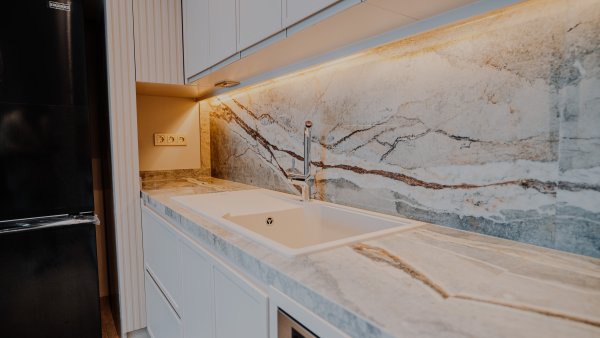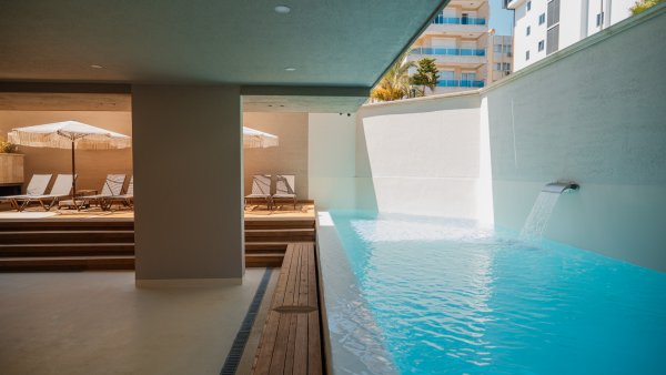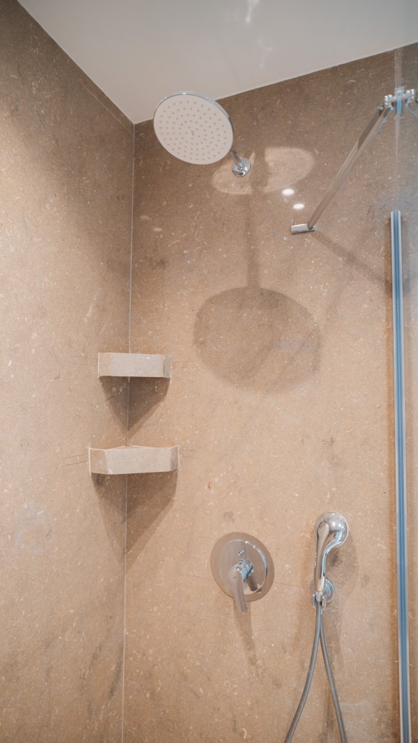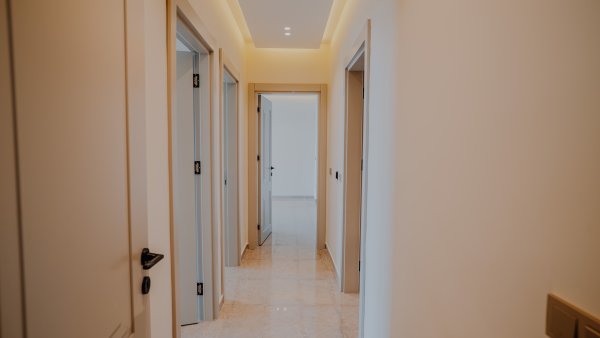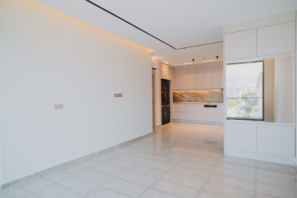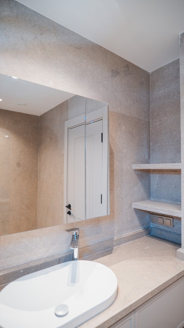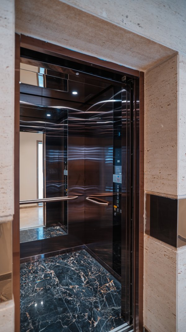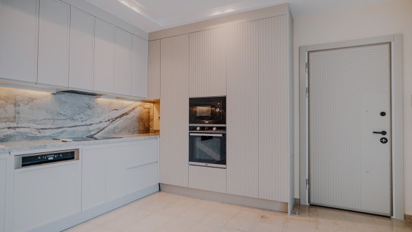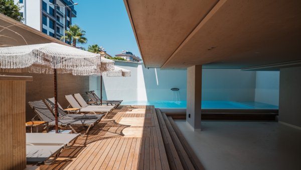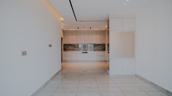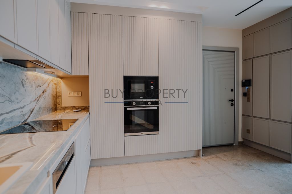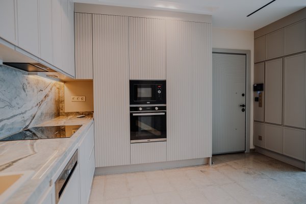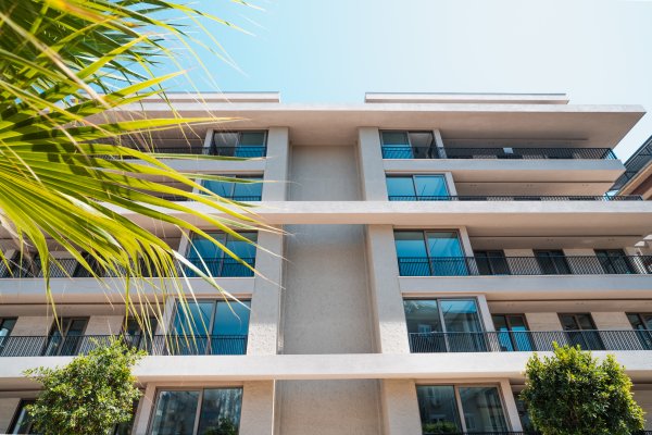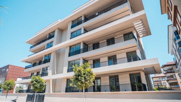 Completed luxury apartments with modern architecture and focus on natural materials.